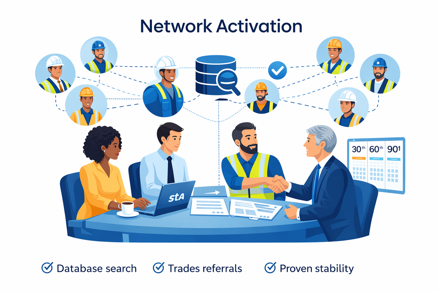 • Activate referral paths within our existing trades network (people trust people, not job ads).