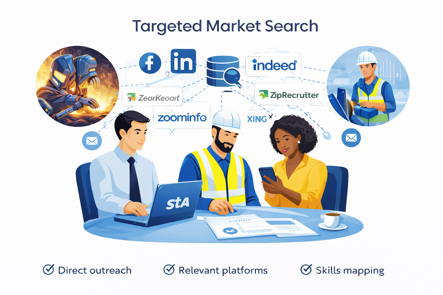 • Direct outreach to passive candidates using trade-specific communities and relationship-based prospecting.