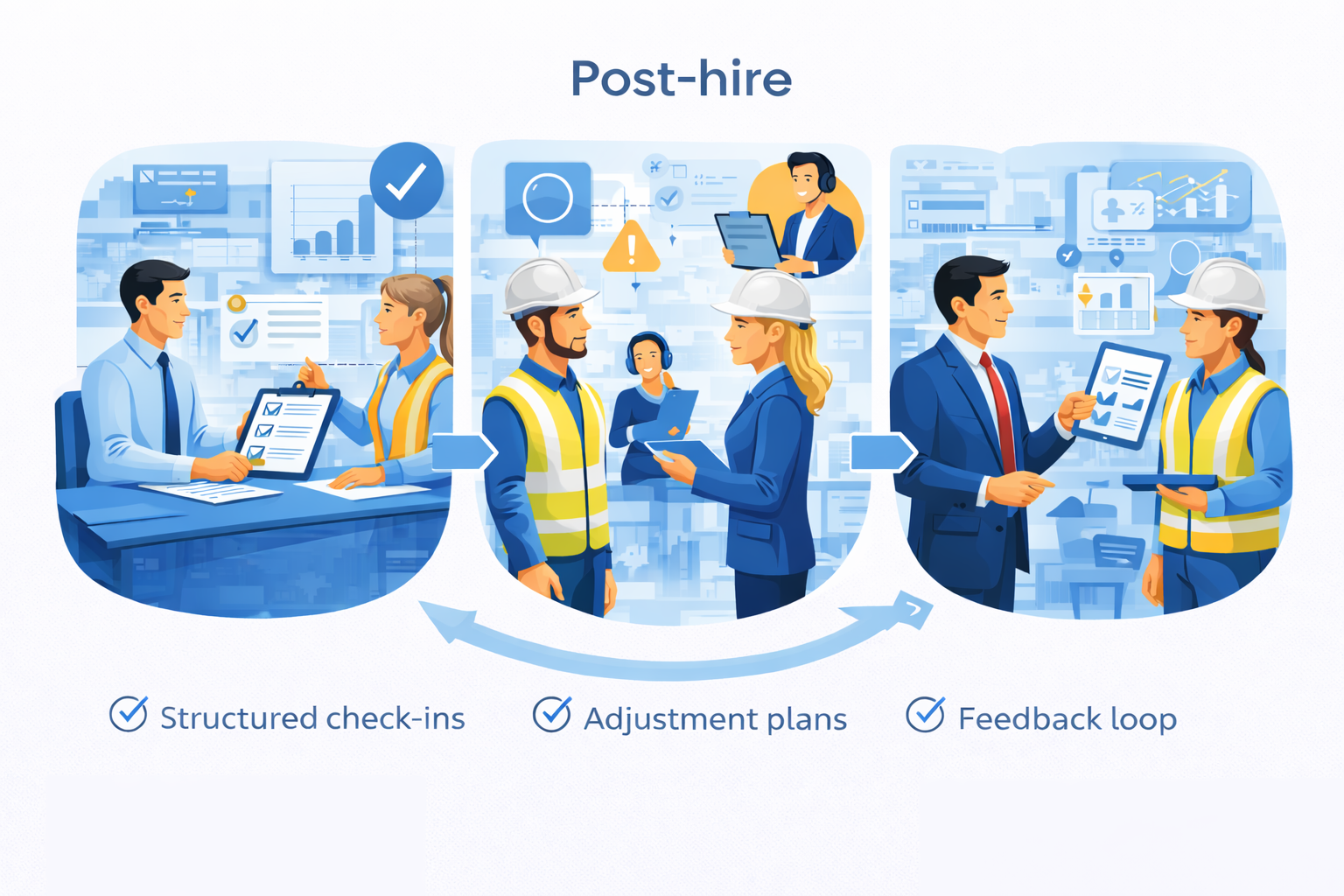 • Intake with operations + HR to define scope, shift realities, safety expectations, and success at 30/60/90 days.